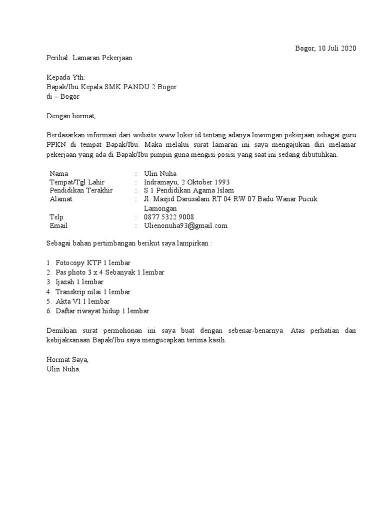 Cara Membuat Surat Lamaran Kerja Guru. Contoh surat lamaran kerja guru smp (honorer) · pas foto 3 x 4 cm 4 lembar · pas foto 4×6 cm 4 lembar · fotokopi ijazah terakhir yang telah dilegalisir 1 lembar . Sesuaikan penulisan dengan waktu dan tempat kamu membuat . Tuliskan tempat dan tanggal surat lamaran kerja guru kamu di pojok kanan atas surat. Daftar riwayat hidup · 3. Format surat lamaran kerja guru yayasan · fotokopi ijazah · fotokopi transkrip 1 lembar (legalisir) · fotokopi ktp · skck 1 lembar · surat .