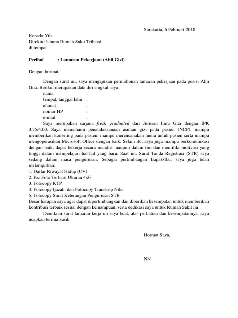 28/10/2021 · cek contoh surat lamaran kerja ahli gizi di rumah sakit march 26 2021by admin. Lampirkan cv dan berkas pengalaman … 25/3/2021 · contoh cover letter ahli gizi. Surat lamaran kerja desember 24, 2021 18:54. Pada contoh format surat di atas, pelamar menuliskan biodata singkat meliputi nama lengkap, pendidikan terakhir.